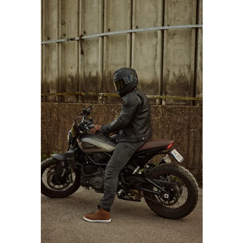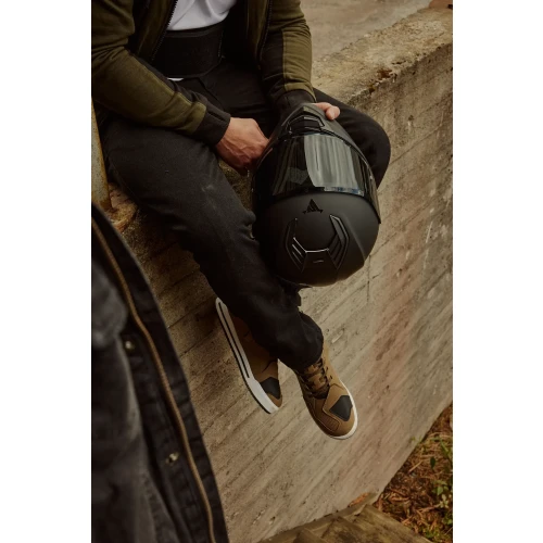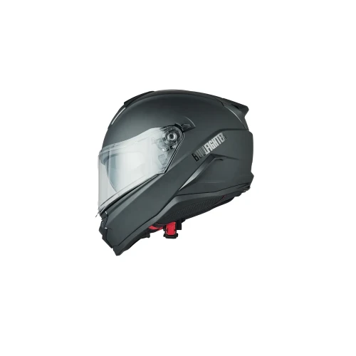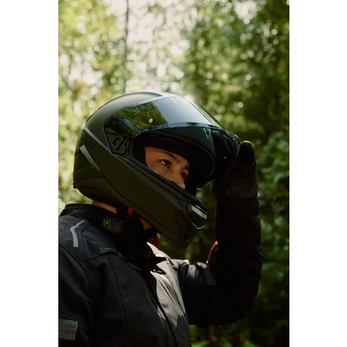 Den er utstyrt med et praktisk integrert solvisir som enkelt vippes ned ved behov – ideelt for kjøring i sollys. Med quick release-spenne tas hjelmen av og på med et enkelt klikk, noe som gjør den ekstra brukervennlig i hverdagen.